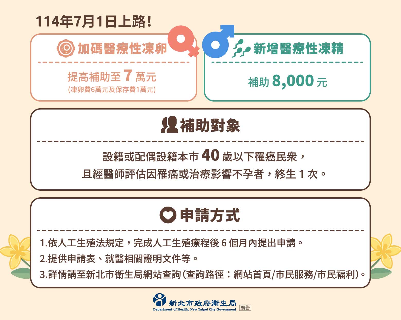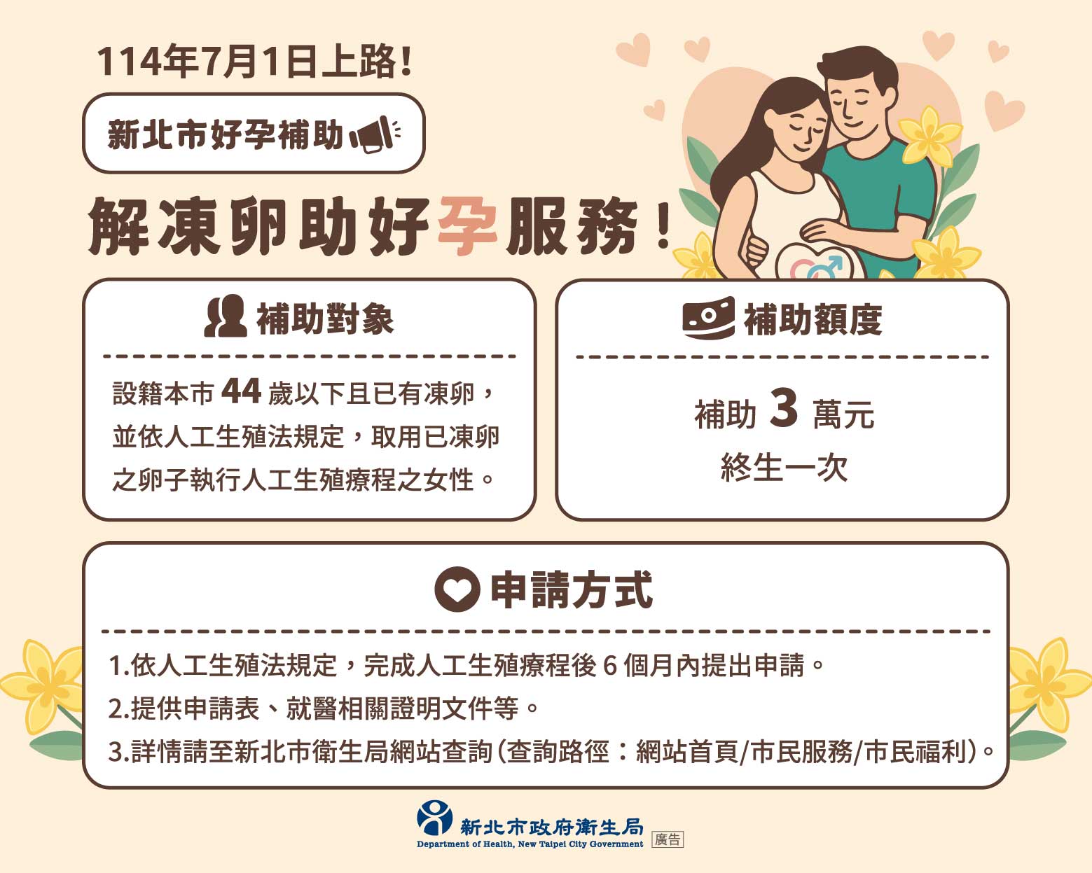 新北市政府宣布,為因應少子化衝擊、協助市民築夢生子,備受關注的「好孕補助三連發」政策已完成各項準備作業,將於114年7月1日正式上路。本次補助措施從生育力保存到實際生育支持一次到位,補助內容包括:全國最高額度的醫療性凍卵補助、首度納入男性的凍精補助、全國首創「解凍卵助好孕」補助。